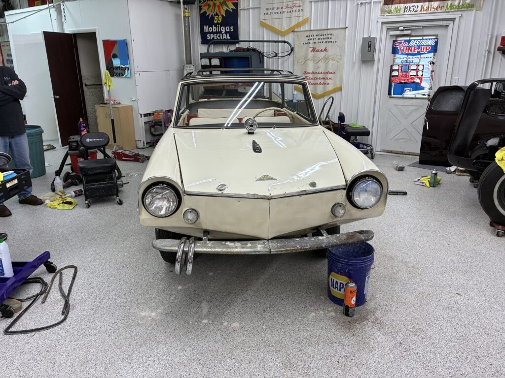 Olson is a collector of unique cars who lives in Deep River, CT, but who has a storage facility/workshop in Middletown. He’s working this winter on the white Amphicar that he acquired about a year ago.